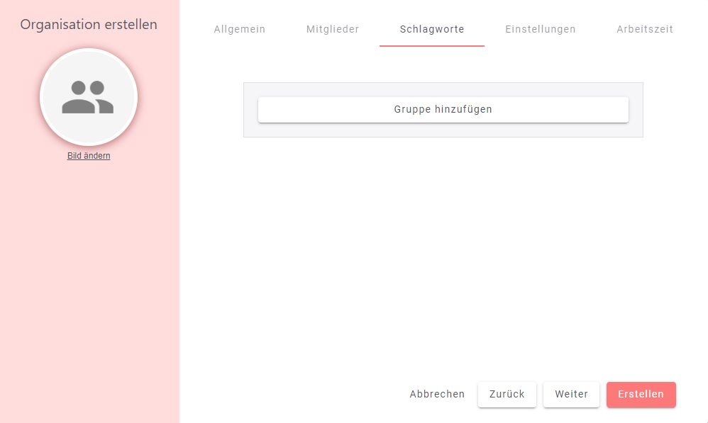Im Reiter „Schlagworte“ können deiner Organisation Schlagwörter hinzugefügt werden um Kategorisierungen zu schaffen und innerhalb der Organisation zu filtern.