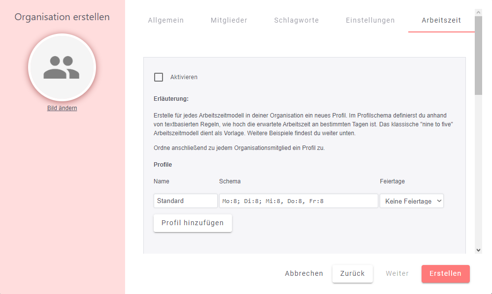 Außerdem können hier die einzelnen Arbeitszeitprofile erstellt und angepasst werden.