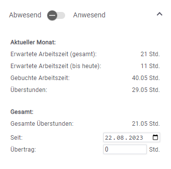 Man kann jetzt Arbeitszeiten erstellen und sieht in der rechten oberen Ecke eine Schaltfläche mit einen „Abwesend – Anwesend“ – Button und dazugehöriger Übersicht für die Überstunden.