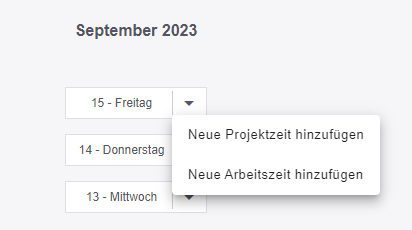 Sind noch keine Zeiten für den Tag angelegt, hat man die Wahl nur eine Arbeitszeit zu erstellen oder eine Projektzeit. Wird eine Projektzeit erstellt, so erscheint auch automatisch die Arbeitszeit für diesen Tag.